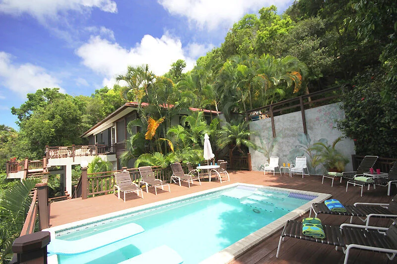 Anole is a 4 bedroom 4.5 bath home with a private pool. This two level design includes the great room and two bedrooms with ensuite baths, plus a half bath on the upper level, and two additional bedrooms with ensuite baths and the pool on the lower level.